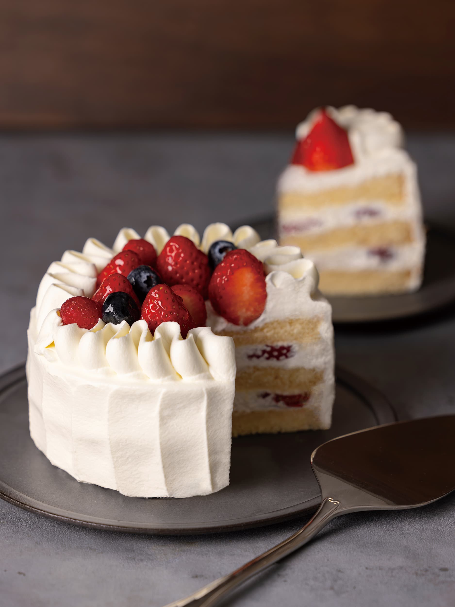 ふんわりとしたスポンジと生クリームのバランスにこだわった、王道スタイルのショートケーキ。ストロベリー、ラズベリー、ブルーベリーの3種のベリーが使われ、食卓を華やかに演出します。 価格は4,500円(税込4,860円)。サイズは直径約12cm、高さ約8cmで、4~5名分。 原材料の一部に卵・乳・小麦を含みます(特定原材料8品目中)。 こちらもキャンドル5本付きで、ケーキボックスと紙袋に入れて提供されます。