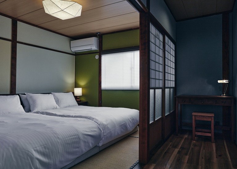 2階には寝室3室とダイニングを配置。日本ベッド社製のマットレスを備えたダブルベッド4台と敷き布団3組で、11名までの大人数でも快適に過ごせます。アメニティは浴衣や館内着、足袋のほか、バスソルトや化粧水・乳液なども用意されています。
