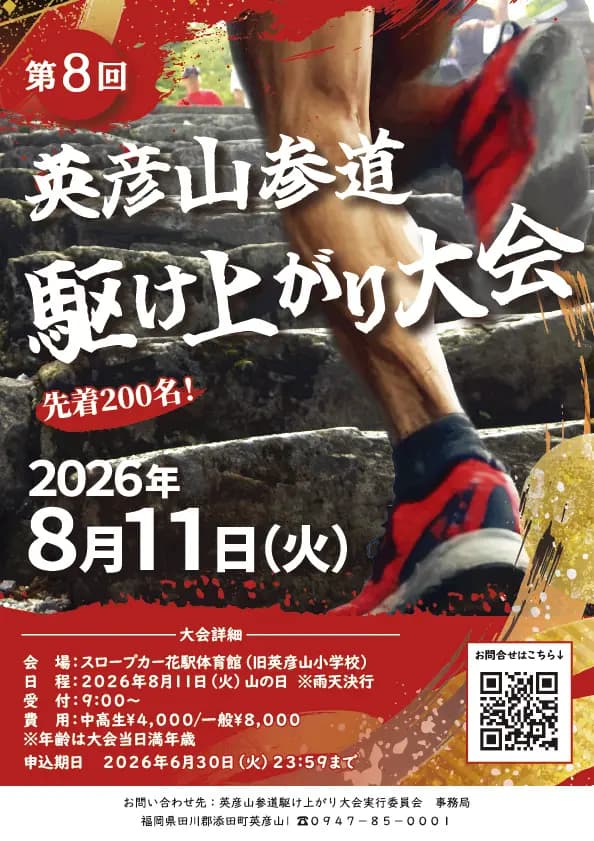 問い合わせ:英彦山参道駆け上がり大会実行委員会 事務局 TEL 0947-85-0001(9:00~17:00)