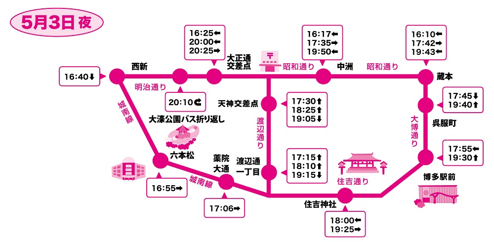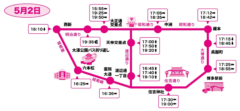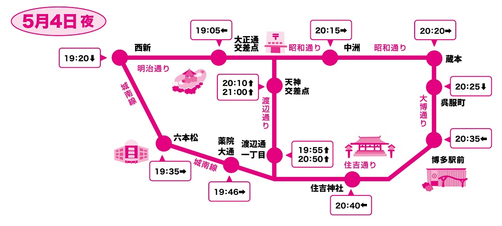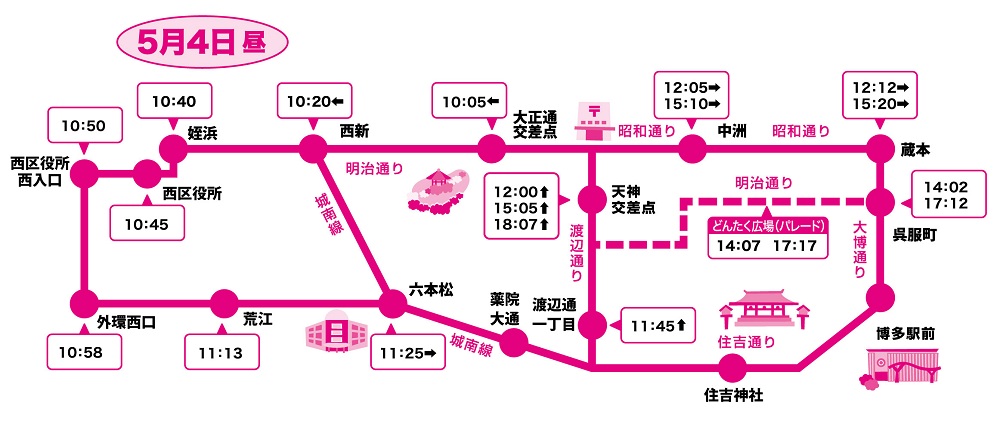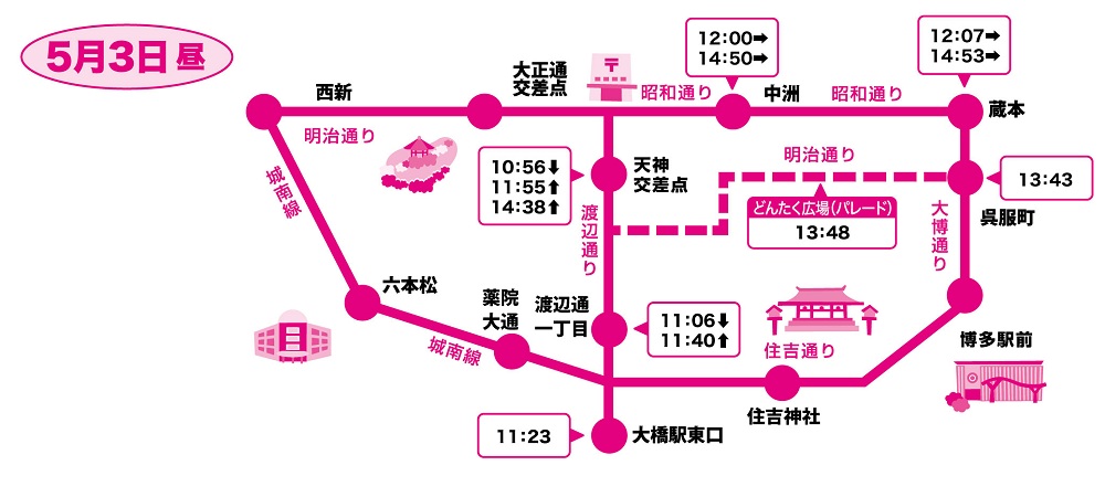 ※“どんたくパレード”では 呉服町~アクロス福岡間 1.3km の区間を運行します。