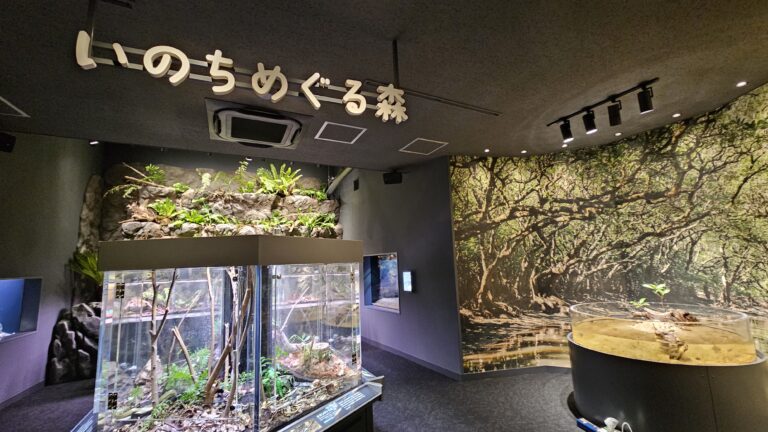 マリンワールドでは、現在奄美の生き物などを展示する「いのちめぐる森」展が開催中で、久留米出身のデザイナ