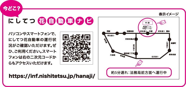 「今、見たい花自動車がどこにいるのか知りたい!」そんな声にこたえ、にしてつ花自動車の運行位置がリアルタイムで配信される「にしてつ花自動車ナビ」が登場。