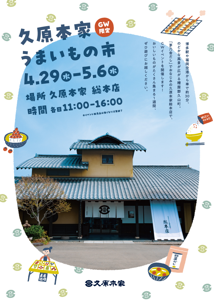 ゴールデンウィーク期間中、福岡・久山町にある「久原本家 総本店」で、地域の食の魅力を集めたイベント「久原本家 うまいもの市」が開催されます。期間は2026年4月29日(水)から5月6日(水)までの8日間。前半と後半で内容が変わる2部構成となっており、旬の野菜や明太子、総本店ならではの限定商品がそろいます。