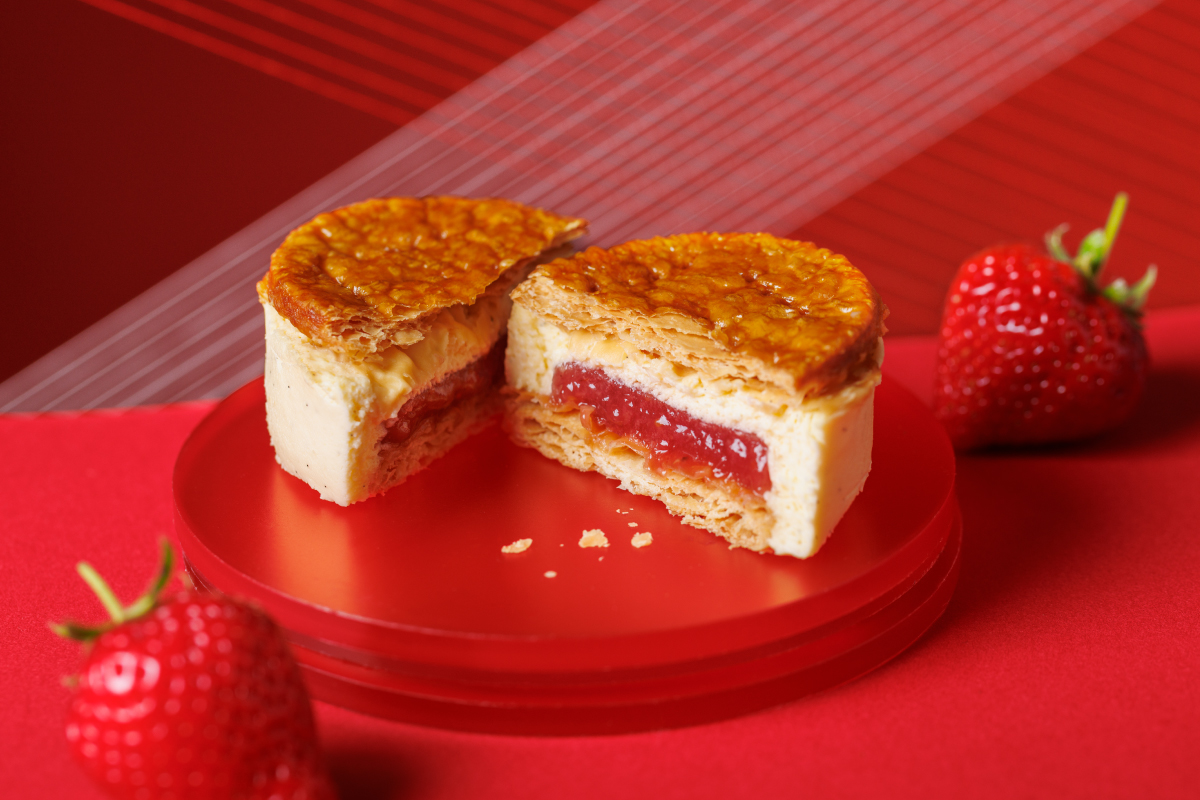 冷蔵商品として登場する「生ミルフィユ〔あまおう苺〕」は、あまおう苺とフランボワーズのフィリングを、生クリームとバターで仕立てたクリームで包んだ一品。キャラメリゼしたパイとアーモンドの香ばしさがアクセントになっています。2個入で税込1,296円。