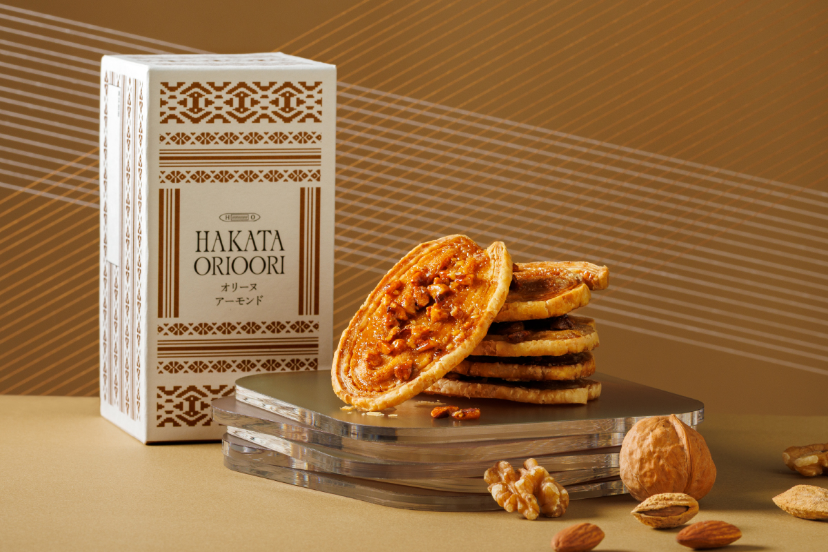 ブランド名の「ORIOORI(オリオーリ)」には、素材、技、想いを幾重にも重ねていく“織る”という姿勢が込められています。経糸と緯糸を重ねて美しい文様を生み出す博多織と、層を重ねて仕上げるパイ菓子。その共通点に着目し、ものづくりの精神をスイーツとして表現しています。