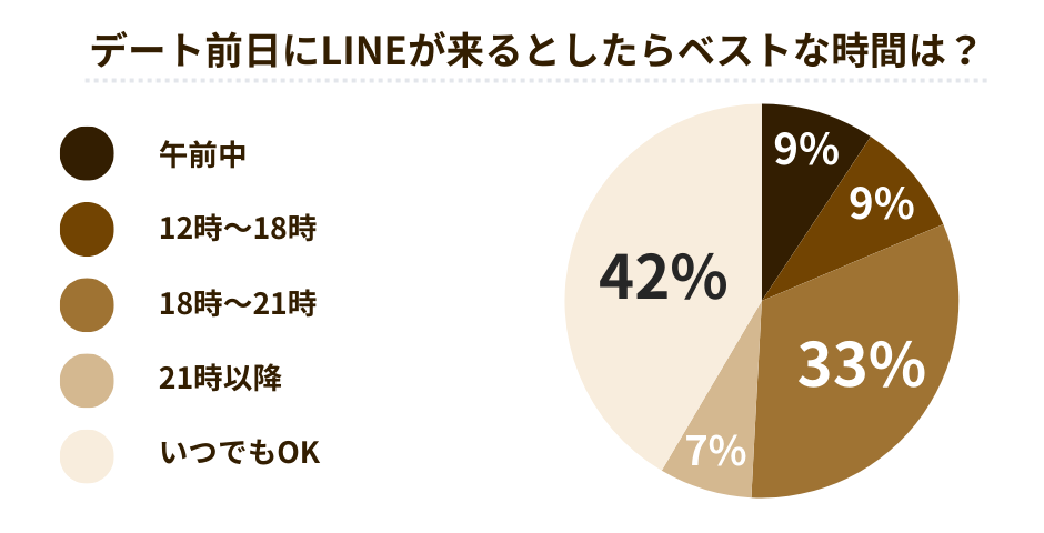相手からデート前日のLINEが届く時間帯は、約4割の人が「いつでもOK」と答えています。また、「夜21時より前にLINEが届くとよい」と回答する人が半数を占めています。