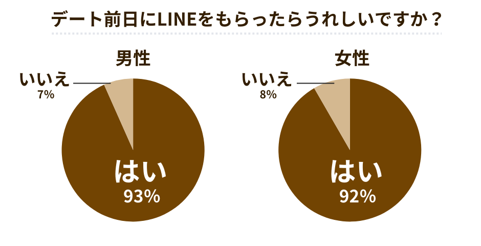 アンケートでは、男女ともに9割以上の人が「デート前日にLINEをもらったらうれしい」と回答しています。